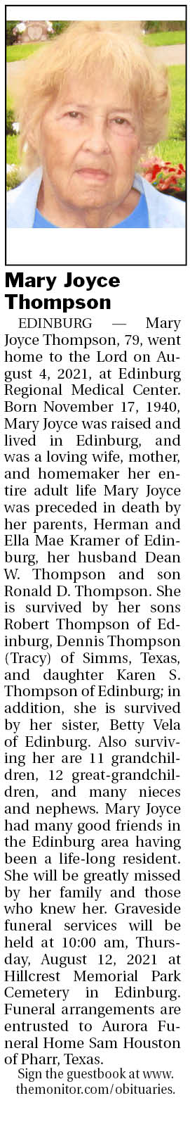 Mary Joyce Thompson EDINBURG — Mary Joyce Thompson, 79, went home to the Lord on August 4, 2021, at Edinburg Regional Medical Center. Born November 17, 1940, Mary Joyce was raised and lived in Edinburg, and was a loving wife, moth